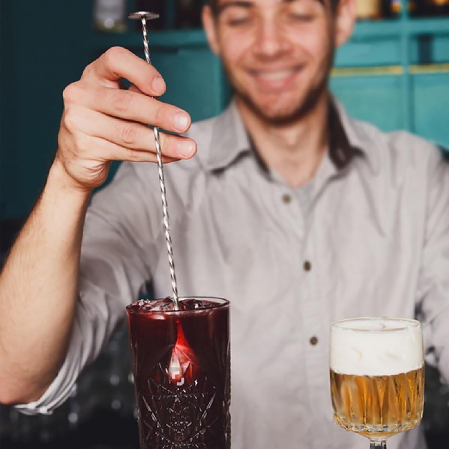 We used the long mixing spoon to stir spirit-forward cocktails and to layer drinks using the back of the spoon technique; it provided good reach and control. The twisted shaft helped with smooth stirring and better integration of ingredients.