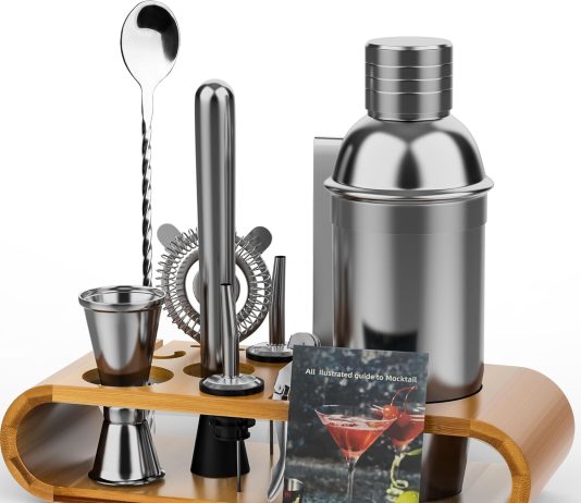 Bartender Kit Cocktail Shaker review: 18-piece stainless set with bamboo stand and recipe booklet. Organized, durable, and beginner-friendly for home bartending