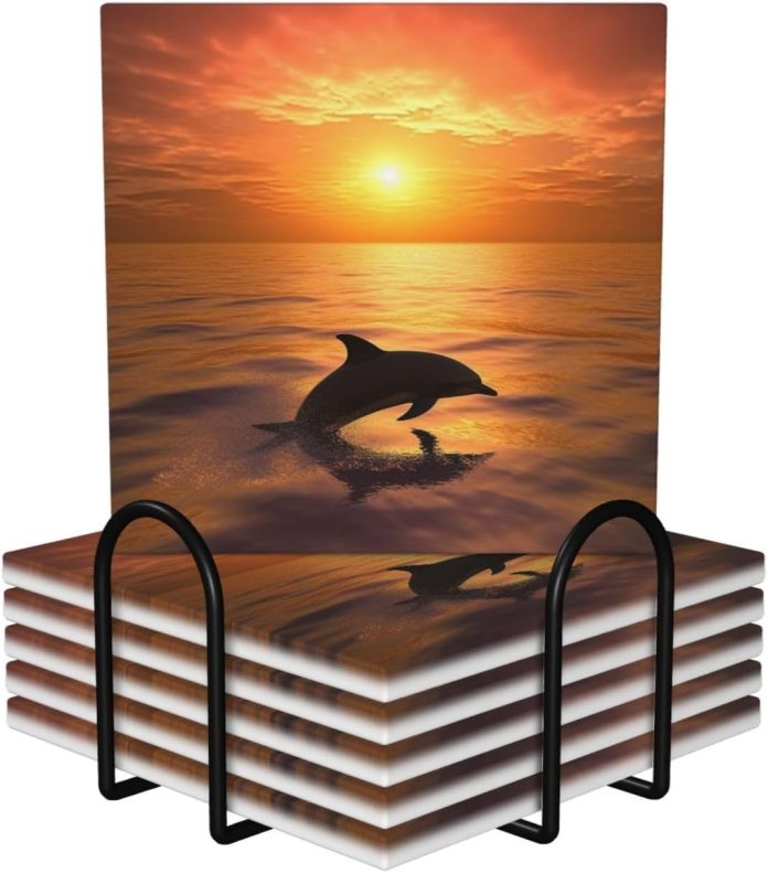 We understand this set includes six ceramic-themed coasters featuring a dolphin-and-sunset motif and a metal holder that keeps them neatly organized. The coasters are designed for tabletop protection, heat insulation, and as a decorative accent for home and kitchen settings.