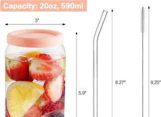 HOMBERKING Glass Cups 8pcs set: 20oz boro glass tumblers with pink silicone lids, glass straws & brushes—versatile for iced coffee, cocktails, beer and gifting.