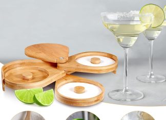 2 Pack Margarita Salt Rimmer Set review: bamboo 3-tier rimmers with lids, foldable and stackable. Tidy salt/sugar/juice rimming, portable, easy to use and clean