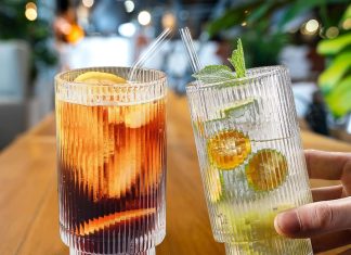 Review: Ribbed Glassware with Straws — stylish, durable 6-piece 16oz set with glass straws & brushes, dishwasher-safe, perfect for smoothies, coffee, cocktails.