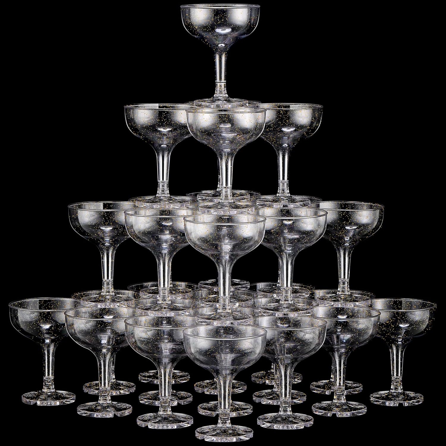 I appreciated how the glasses combined a celebratory look with practicality. The gold glitter adds visual flair that makes disposable cups feel more special, and the stackable stemmed design saved a ton of space when I packed them away.